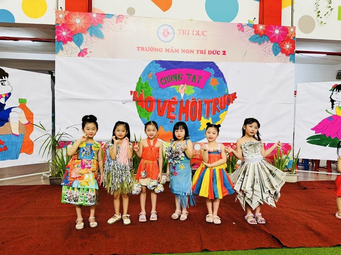 Với thông điệp "Chung tay bảo vệ môi trường" các siêu mẫu nhí của trường MN Trí Đức 2 đã trình diễn các bộ sưu tập thời trang được thiết kế từ các nguyên vật liệu mở, có thể tái chế, thân thiện với môi trường.