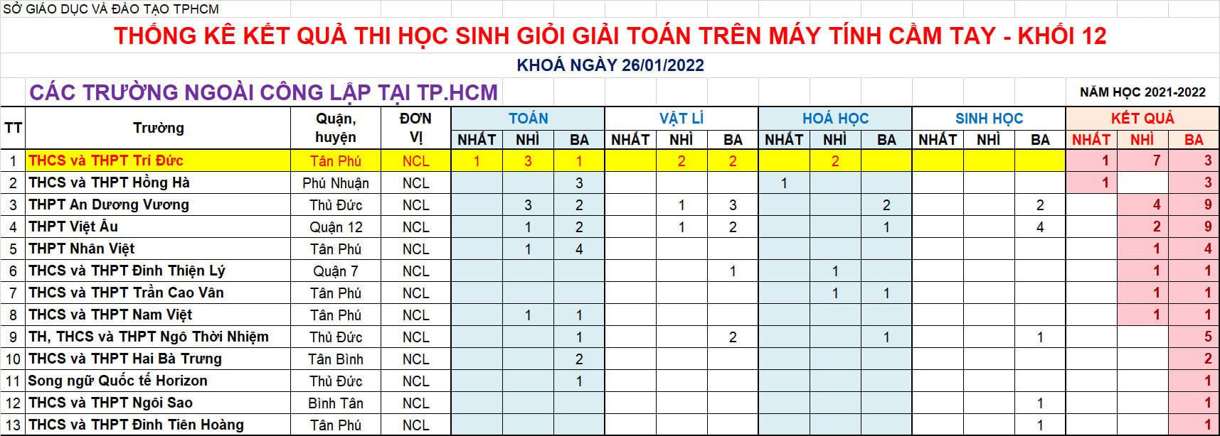 Một tin cực vui đầu xuân Nhâm Dần 2022, khi đội tuyển Học Sinh Giỏi Khối 12 của trường chúng ta đã xuất sắc giành được 11 giải cao tại cuộc thi HỌC SINH GIỎI GIẢI TOÁN TRÊN MÁY TÍNH CẦM TAY CẤP THÀNH PHỐ NĂM HỌC 2021-2022.