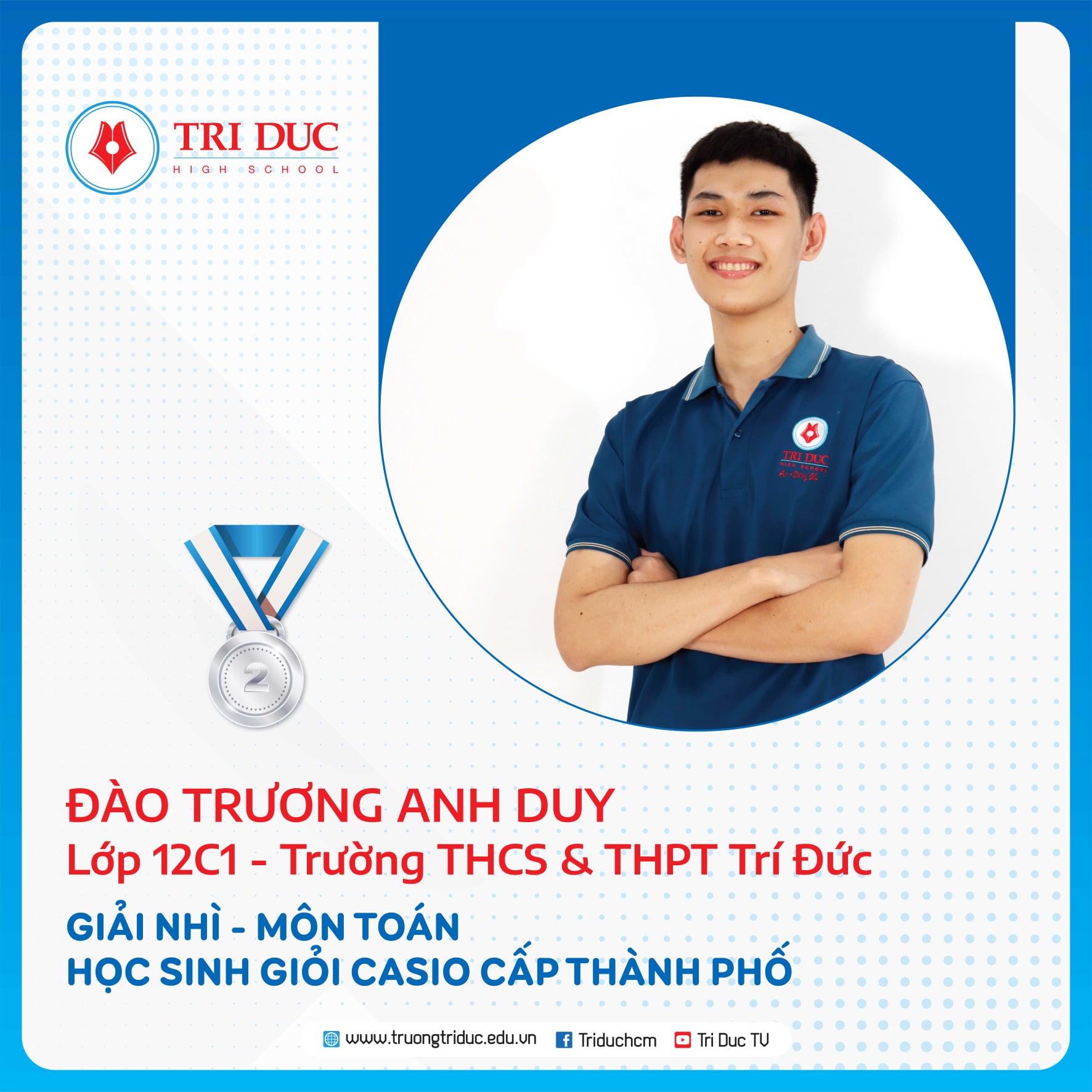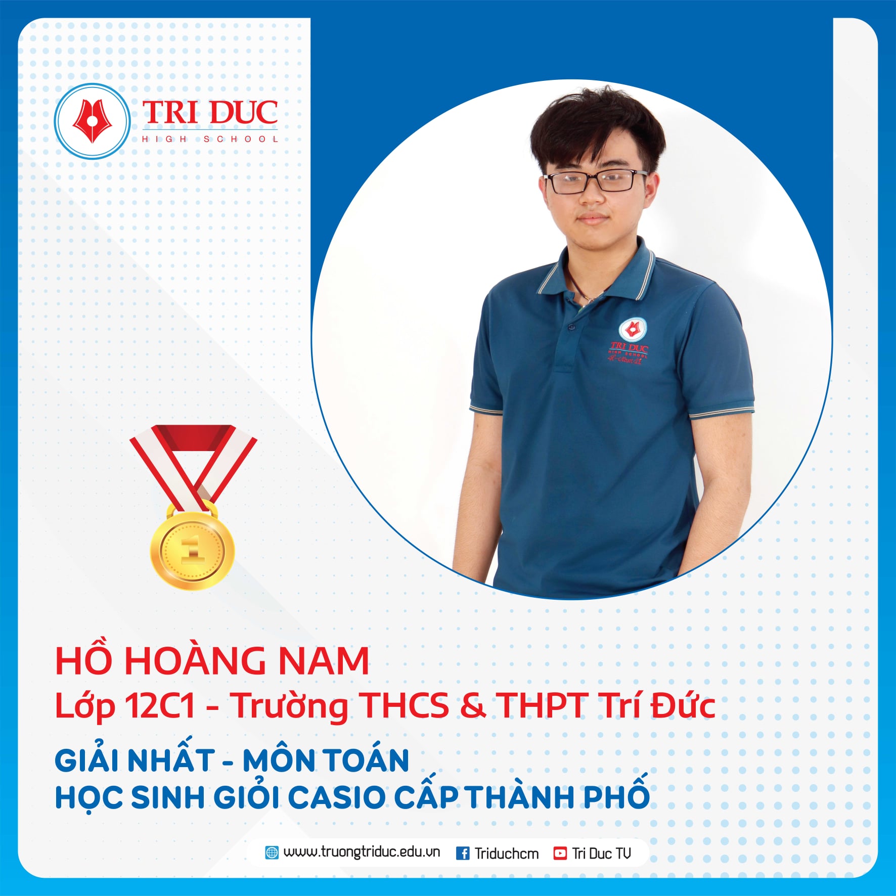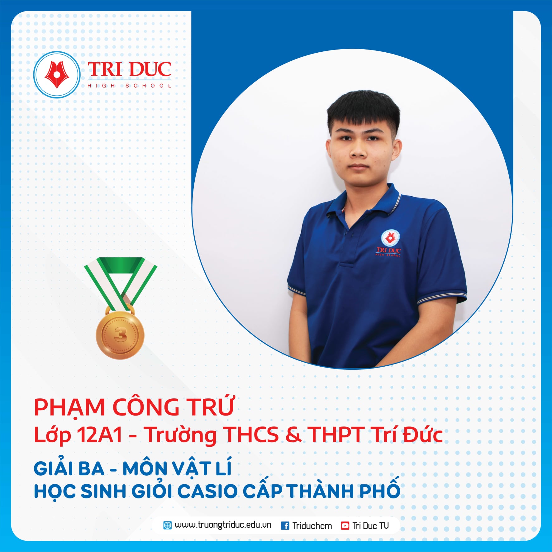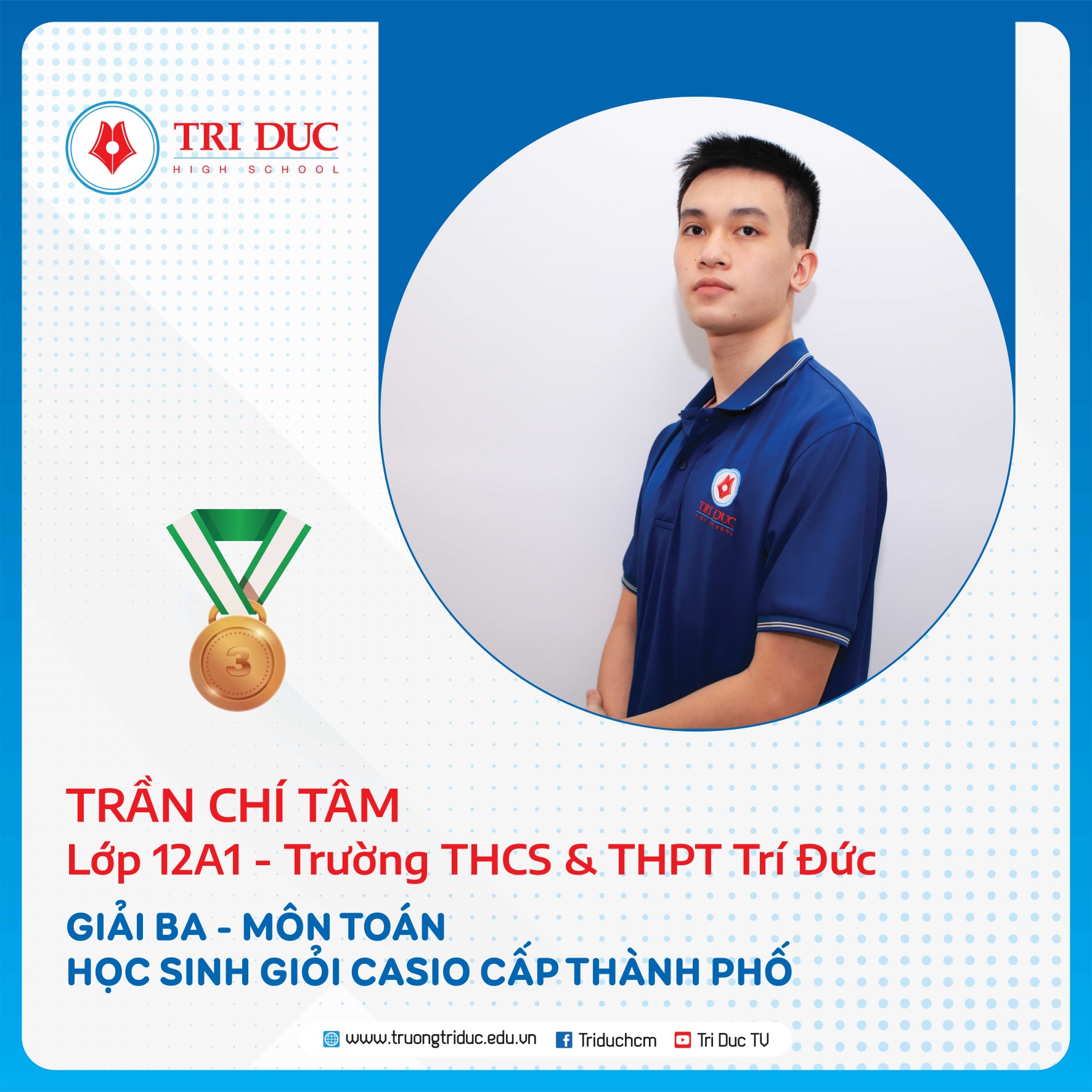 Đây là cuộc thi dành cho HỌC SINH GIỎI Khối 12 của các Ttrường THPT trên địa bàn TP. Hồ Chí Minh với hàng nghìn thí sinh tham dự. Đội tuyển HỌC SINH GIỎI Khối 12 của Trường Trí Đức đã xuất sắc giành được 11 GIẢI CAO tại cuộc thi này, trong đó: 1 GIẢI NHẤT, 7 GIẢI NHÌ, 3 GIẢI BA.
