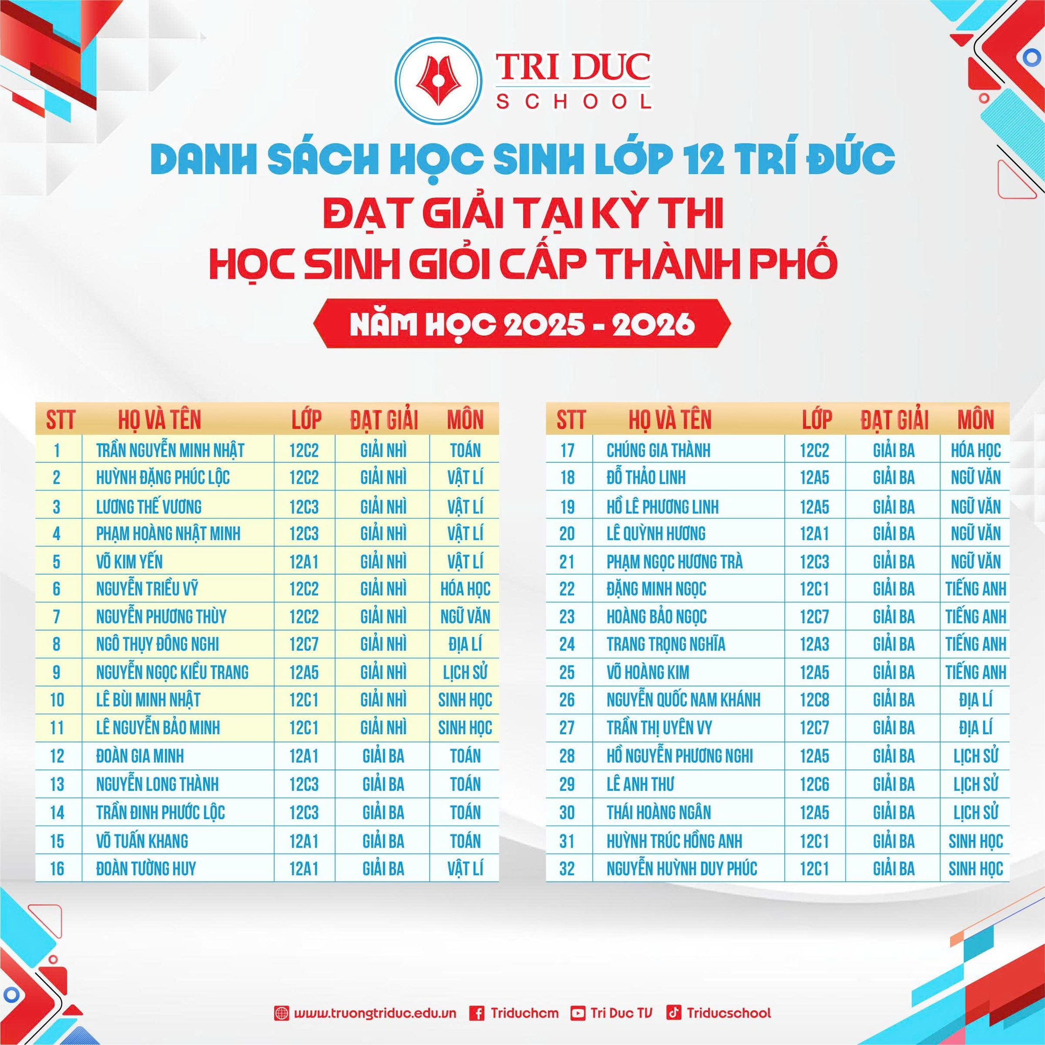 Trường Tiểu học – THCS & THPT Trí Đức trân trọng chúc mừng các em học sinh lớp 12 đã đạt thành tích xuất sắc tại Kỳ thi chọn Học sinh giỏi cấp Thành phố dành cho học sinh phổ thông năm học 2025 – 2026.