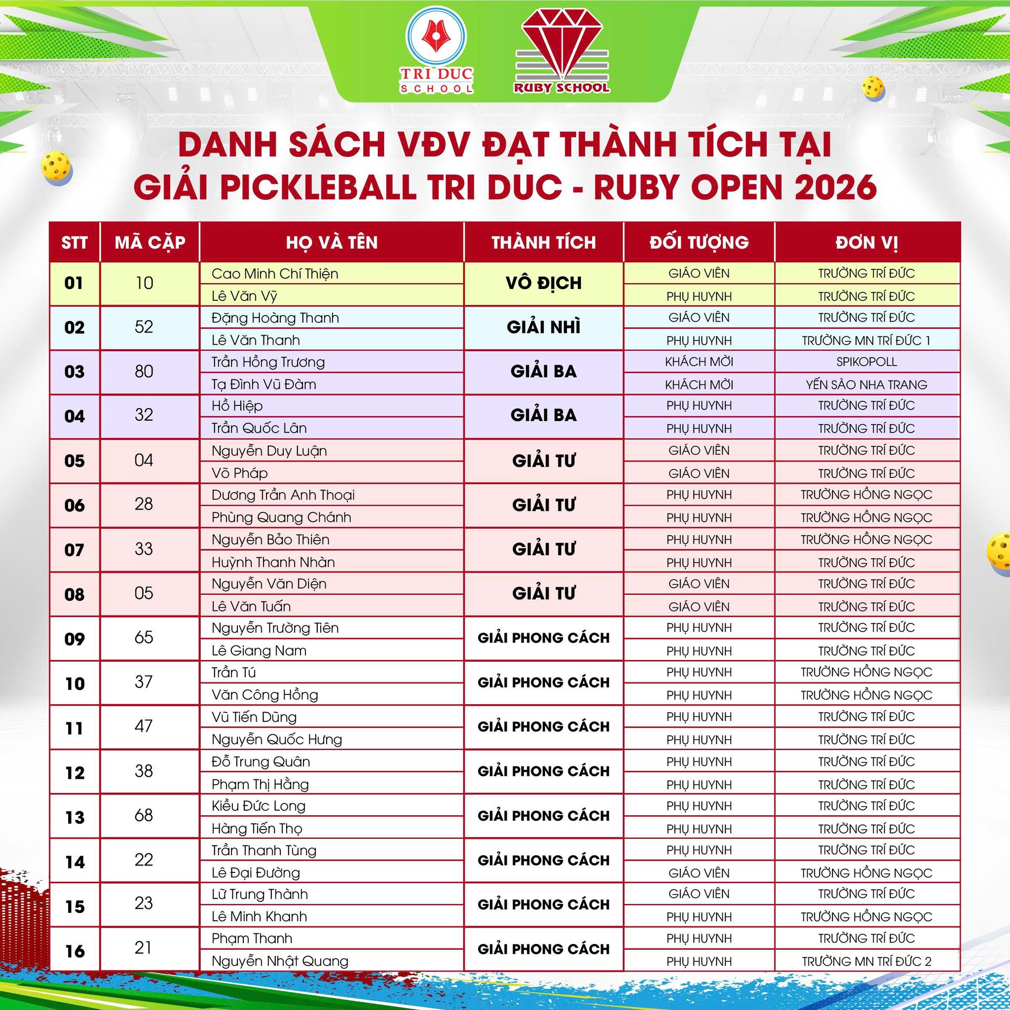 Sau một ngày thi đấu sôi nổi và đầy cảm xúc tại sân Picklecool, Giải Pickleball Tri Duc – Ruby Open 2026 đã chính thức khép lại với những kết quả ấn tượng!