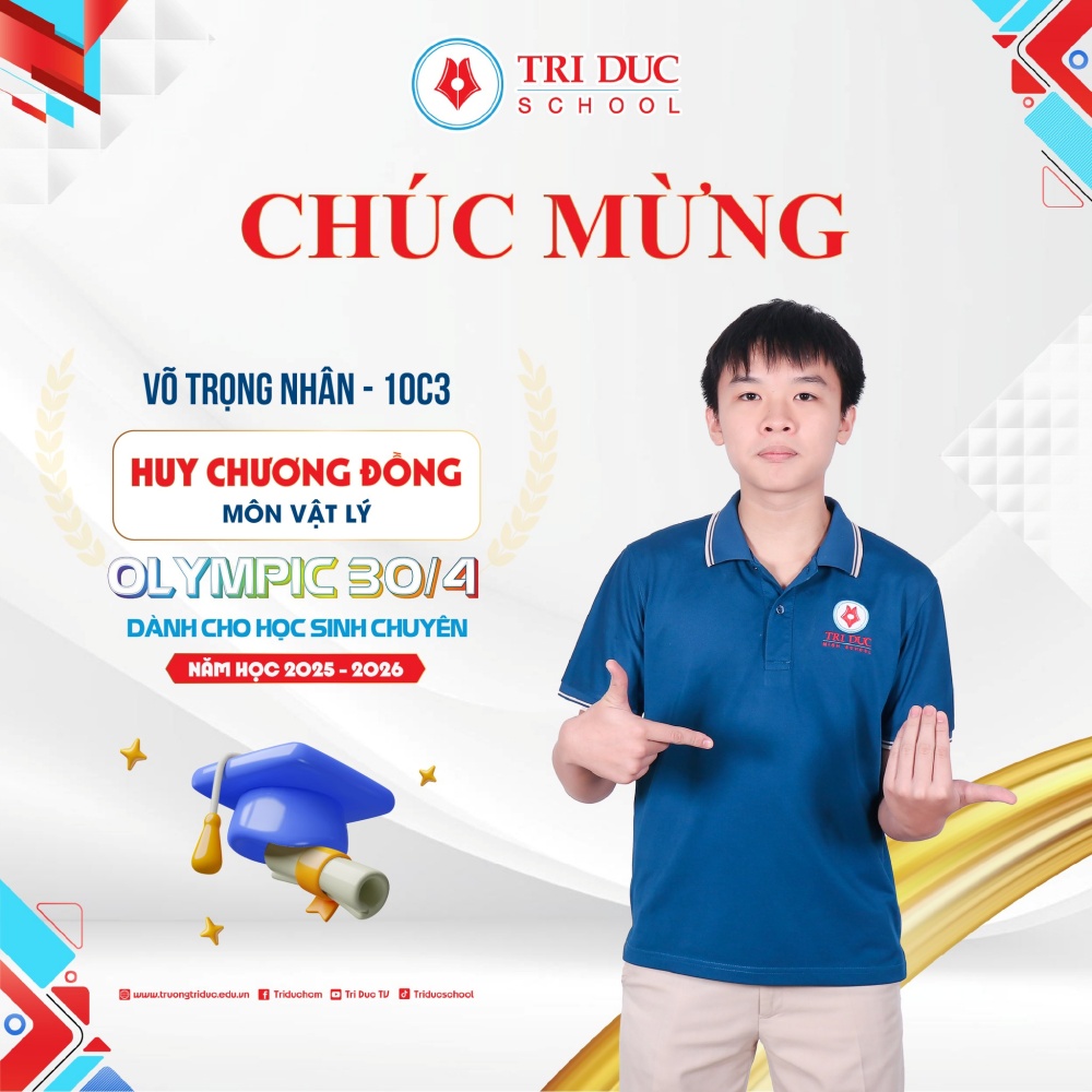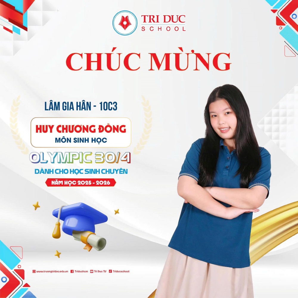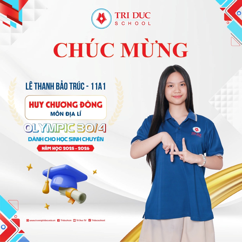 Trường Tiểu học, THCS & THPT Trí Đức trân trọng chúc mừng các em học sinh đã đạt thành tích ấn tượng tại Kỳ thi Olympic 30/4 dành cho học sinh chuyên, Năm học 2025 - 2026.