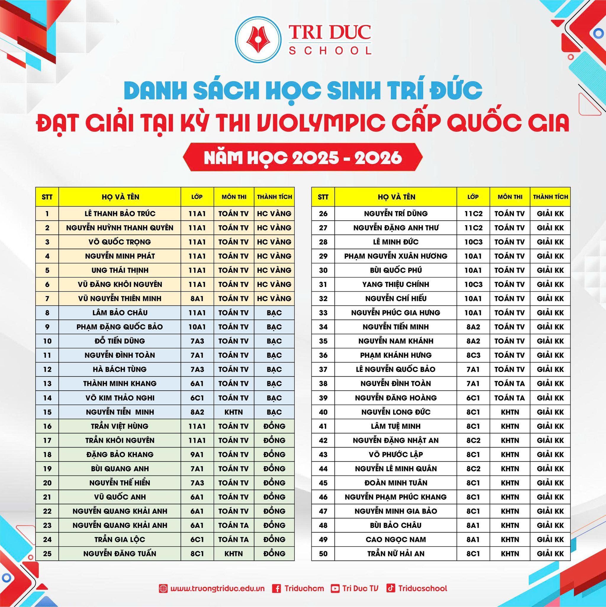 Trải qua nhiều vòng thi liên tiếp với độ sàng lọc khắt khe từ cấp trường, cấp cụm trường đến cấp thành phố, nơi mức độ cạnh tranh ngày càng cao và chỉ những học sinh thật sự xuất sắc mới có thể đi tiếp. Học sinh Trí Đức đã khẳng định chất lượng nổi bật khi chính thức góp mặt và tỏa sáng tại sân chơi Violympic cấp Quốc gia năm học 2025–2026.