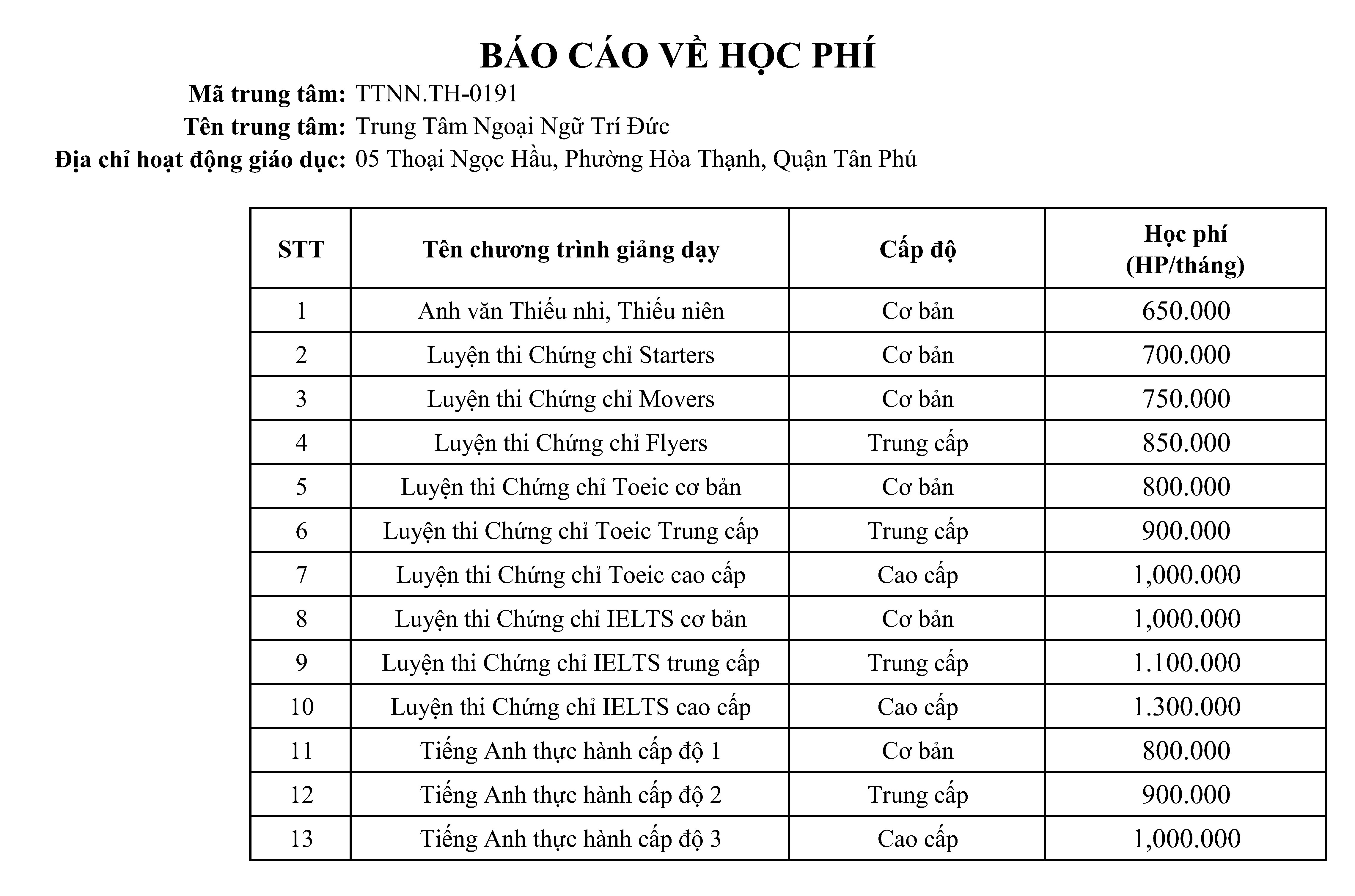 Với định hướng phát triển bền vững, phương châm “Học thật – Dạy tốt – Kết quả cao” cùng sự đầu tư nghiêm túc vào con người và hệ thống, Trung tâm Ngoại ngữ Trí Đức cam kết tiếp tục đồng hành cùng học viên trên hành trình chinh phục ngoại ngữ và hội nhập quốc tế.