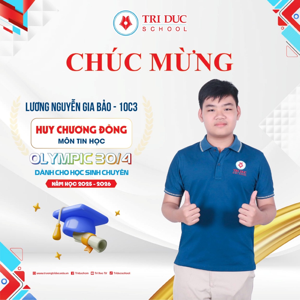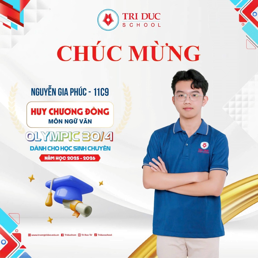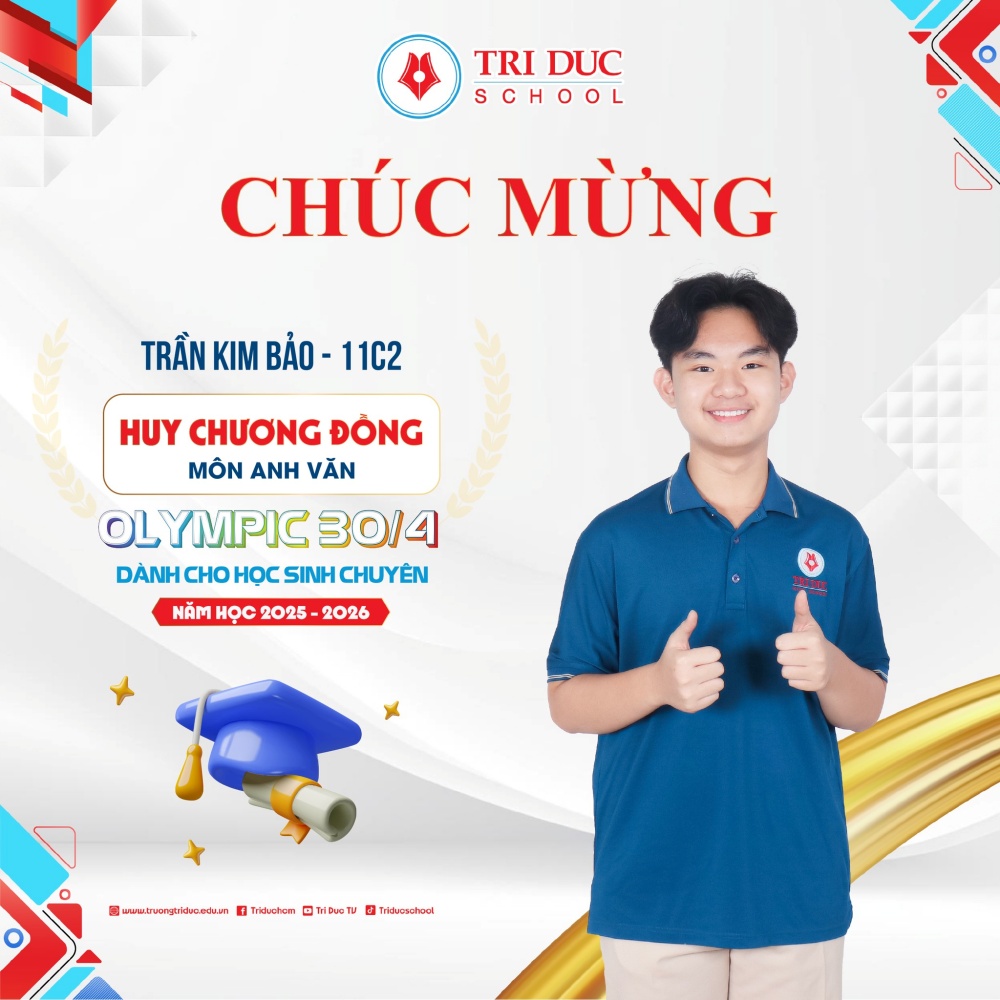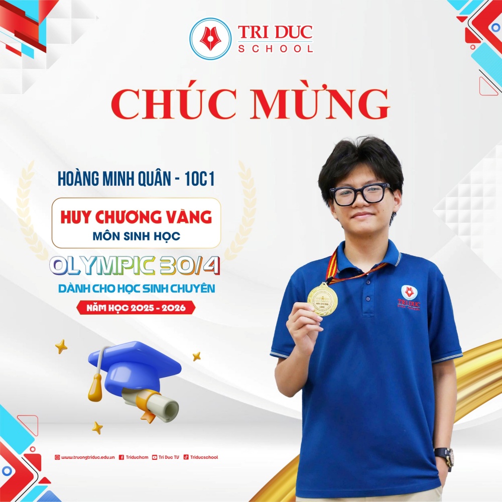 Trường Tiểu học, THCS & THPT Trí Đức trân trọng chúc mừng các em học sinh đã đạt thành tích ấn tượng tại Kỳ thi Olympic 30/4 dành cho học sinh chuyên, Năm học 2025 - 2026.